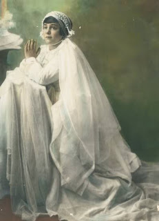 Imelda trong bộ áo dòng trắng, mắt hướng về trời, đôi mắt rực sáng, hai